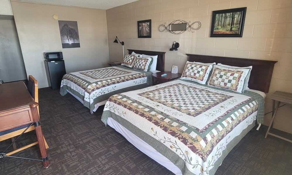 These updated, clean economy rooms feature two queen-sized beds, as well as a mini-fridge, microwave, hairdryer, coffee pot, smart TV, and free Wi-Fi. All double queen economy rooms at the Kansas Country Inn have a private bathroom, with a tub and shower combination. All rooms are non-smoking, and some rooms are pet friendly. Pet fees are $10 per night.